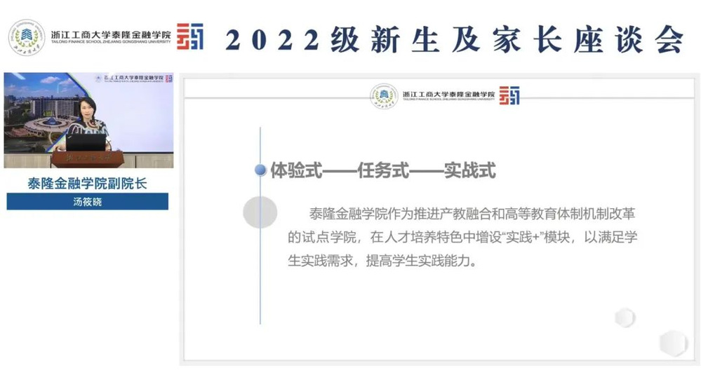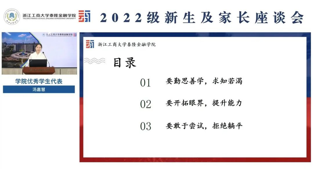 优秀学生代表汤嘉慧同学通过回顾自己过去两年的学习经历,向大家分享了三点:第一勤思善学,求知若渴,第二,开拓眼界,提升能力,第三敢于尝试,拒绝躺平。建议各位新生学弟学妹们勇于尝试,多去参加一些活动,多给自己一些机会,在大学的空余时间学习几项有用的技能。并提醒学弟学妹们大学的首要任务还是学习,不能本末倒置,一定要平衡好学习、工作和生活三者关系。最后汤嘉慧同学也祝愿每一位即将步入大学的学弟学妹们,仰望星空,脚踏实地,期待在泰隆遇见更好的你。