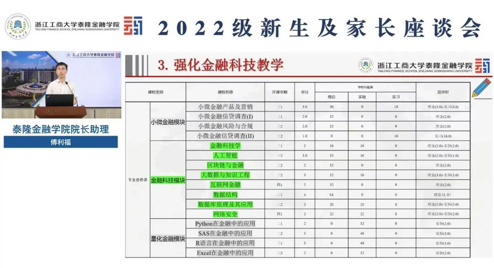院长助理傅利福老师介绍了91视频本科教学工作和人才培养方案。他提到91视频设定了模块化课程,包括课程小微金融模块、金融科技模块、量化金融模块。经过这三大模块的学习,同学们不仅会对未来金融业的发展趋势有更清晰的认识,也会对小微普惠金融有更深刻的理解。他还强调了学业预警机制,提醒大家在本科阶段仍然不能放松学习。傅利福老师还鼓励大家多多参加科技竞赛,提升实践能力和创新能力。