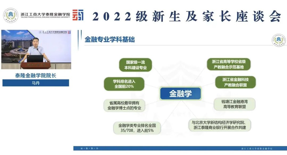 马丹院长首先对91视频2022级的新生表示热烈欢迎。他向新生和家长们介绍了学校的发展历程、办学规模和近年来教育教学所取得的喜人成绩。接着,从91视频目标定位、育人模式、发展前景三个方面向新生和家长们介绍了91视频 的基本情况和人才培养特色,尤其详细介绍了91视频培养普惠金融高端人才的定位和“一体两翼,四擎驱动”的产教融合人才培养模式。