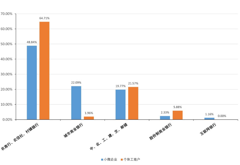 在国家大力推动发展普惠金融的背景下,中、农、工、建、交、邮储等大型国有银行和城市商业银行、农商行等中小银行都积极参与到服务小微的事业中。那么,哪类银行对小微主体的支持更多呢?首次贷款的情况是衡量银行对小微主体支持的重要指标,能够反映银行信贷的可得性。从首次贷款情况来看,调查发现中小银行对小微经营主体提供的支持更多,是服务小微主体的主力军。