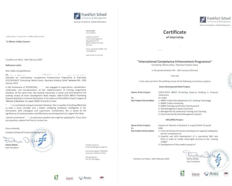 大三暑假,我参与了91视频推荐的德国法兰克福财经管理大学的暑期交换项目,共参与世界银行和亚洲开发银行的两个实习项目,成功进入FS国际咨询服务部发展金融咨询人才储备库。