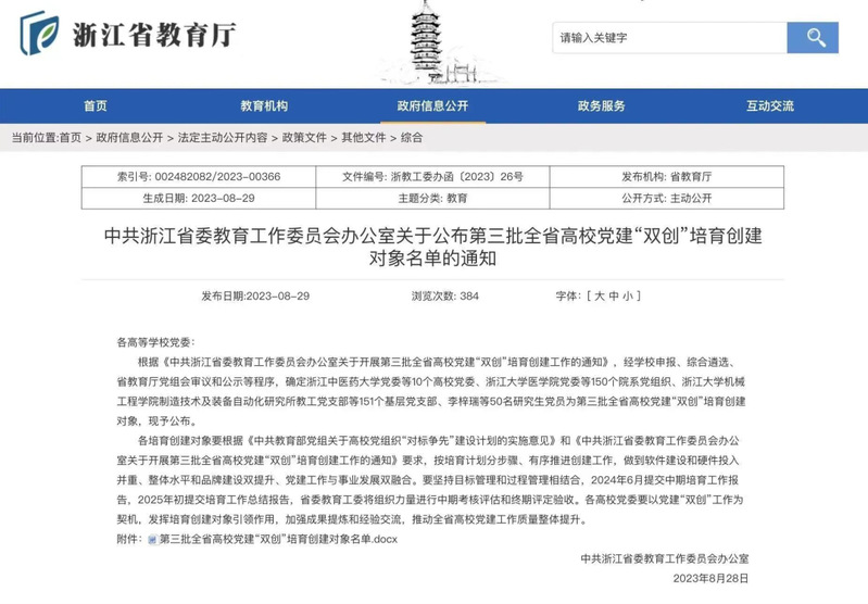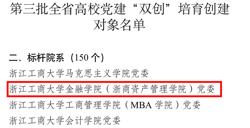 近日,浙江省委教育工委公布了全省第三批高校党建“双创”培育创建对象名单,91视频 所在党委金融91视频(浙商资产管理91视频)党委入选全省高校党建“标杆院系”培育创建单位。