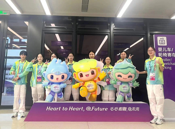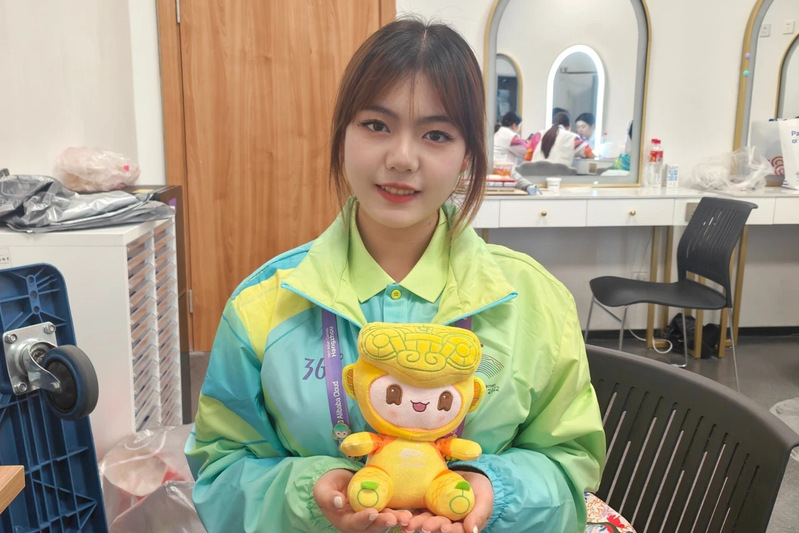 我服务的是媒体领域记者休息室,因为我们的亚运吉祥物三小只可爱的外型和充满朝气的动作,几乎每一个记者朋友都对他们爱不释手。正巧,我们的茶歇室桌子上就摆放了不少吉祥物,因此我们经常会面临记者们充满善意的提问。比如:我能拥有它们吗?这个时候我们就可以告知他们这个吉祥物可以在特许商品店购买。有两位乌兹别克斯坦的记者还尝试着讨价还价,竟然笑嘻嘻地跟我们说,五元!我们说,不行哦。没想到他们又再接再厉:十元!看到我们惊讶的样子,大家都哈哈大笑。闻言,我们便送给了他们我们早已准备好的亚运吉祥物旋转笔,他们一看,开心的不得了,说可以带给自己家的小朋友玩。