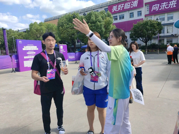 我所工作的地方是临浦场馆南门观众安检口,所有持有工作证的工作人员,运动员不可以从观众安检口进入场馆,需要绕路到北门的持证人员安检口进入。我遇到了两个持有运动员证的韩国运动员,我就用我拙劣的英语和韩国运动员解释为什么他们不能从这里进入场馆,需要怎么走才能找到持证人员安检口。两个韩国运动员的英语也比较差,所以我们之间的交流只能用简单的单词交流,最后我们之间通过“啊啊啊!yeah!yeah!yeah!”达成了共识,顺利地让他们找到正确的安检口。
