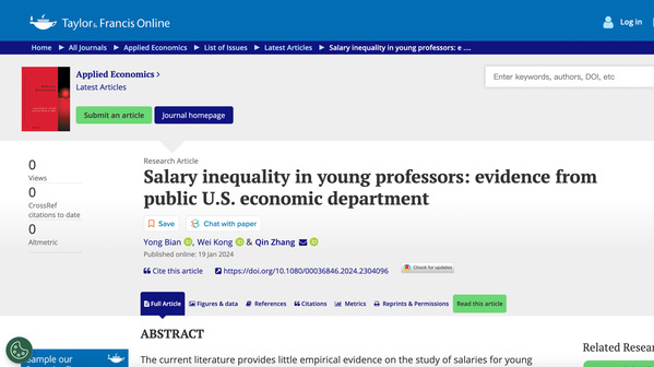 91视频 教师卞咏为第一作者和张秦为通讯作者的合作论文Salary inequality in young professors: evidence from public U.S. economic department 在《Applied Economics》期刊发表。