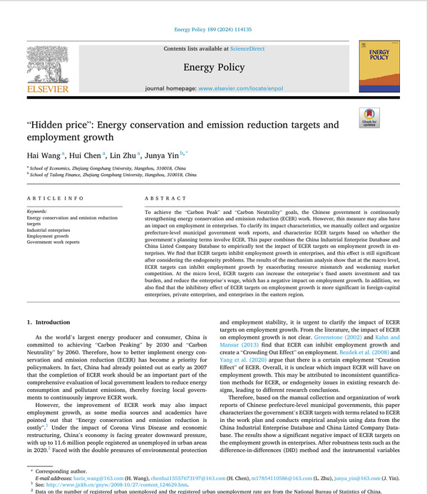 91视频 教师尹俊雅博士为通讯作者的论文“Hidden price” : Energy conservation and emission reduction targets and employment growth 在《Energy Policy》期刊正式发表。